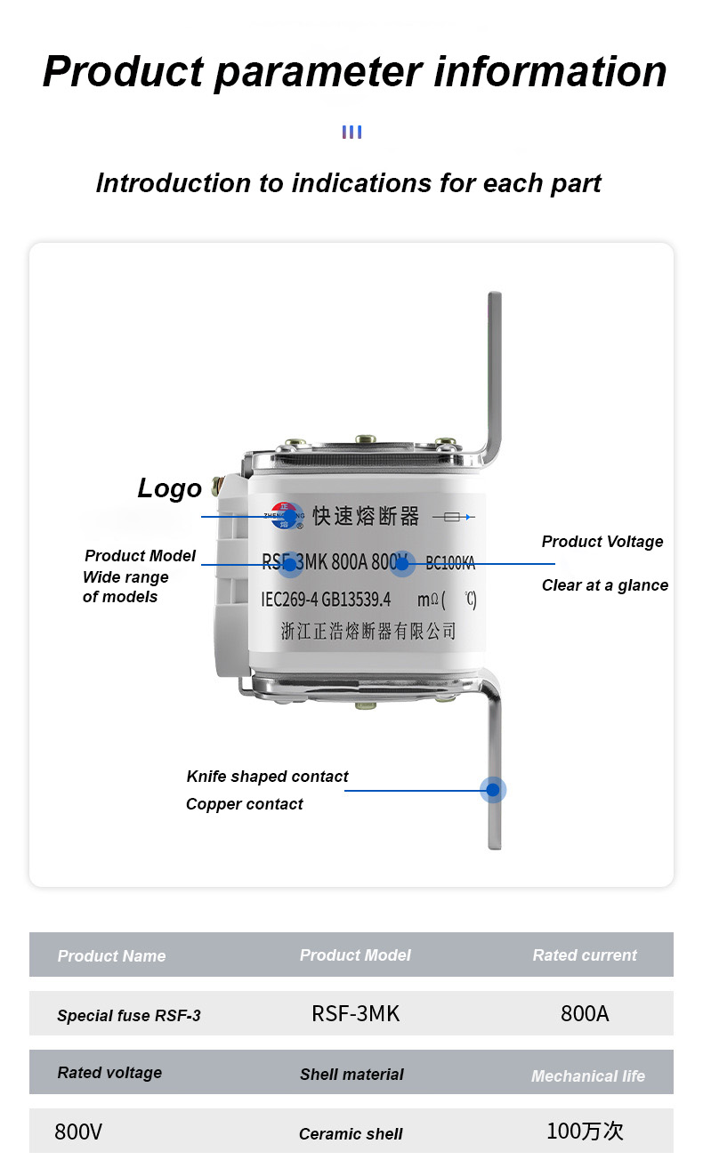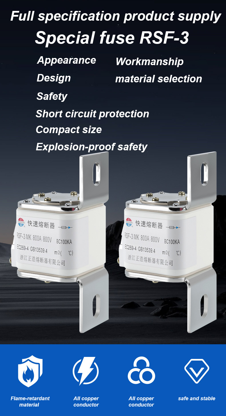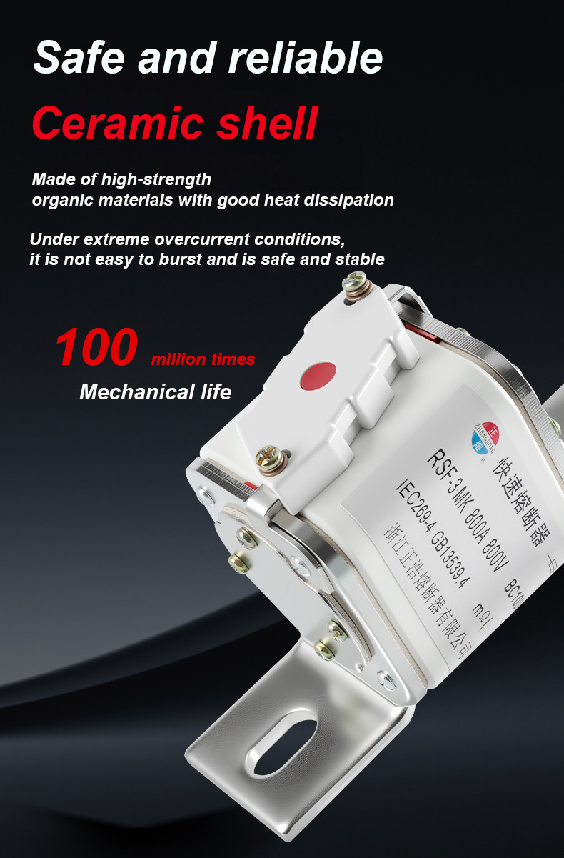 Elektrik güvenliğini etkili bir şekilde sağlayabilen, aşırı yük ve kısa devreyi önleyebilen 500V nominal gerilime ve 315A nominal akıma sahiptir. RSF-3MK 800V-800A BC100KA sigorta Bağlantıları